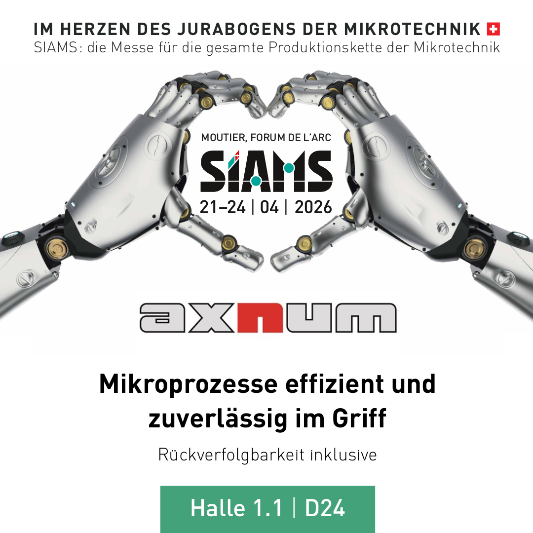 Vom 21.-24. April 2026 werden wir auf der SIAMS in Moutier sein. Im jurassischen Industriezentrum gelegen, führt die SIAMS alle zwei Jahre die Entscheidungsträger der Industrie zusammen und präsentiert die Produktionsmittel der Mikrotechnik.