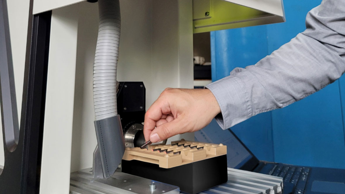 Dank des grossen Arbeits- und Beschriftungsraum der kompakten Anlage können die Formstichel vom Bediener in einer Mehrfachaufnahme unter dem Laser platziert werden. Die Laserbeschriftung erfolgt so äusserst speditiv und es können auch grössere Mengen bearbeitet werden.