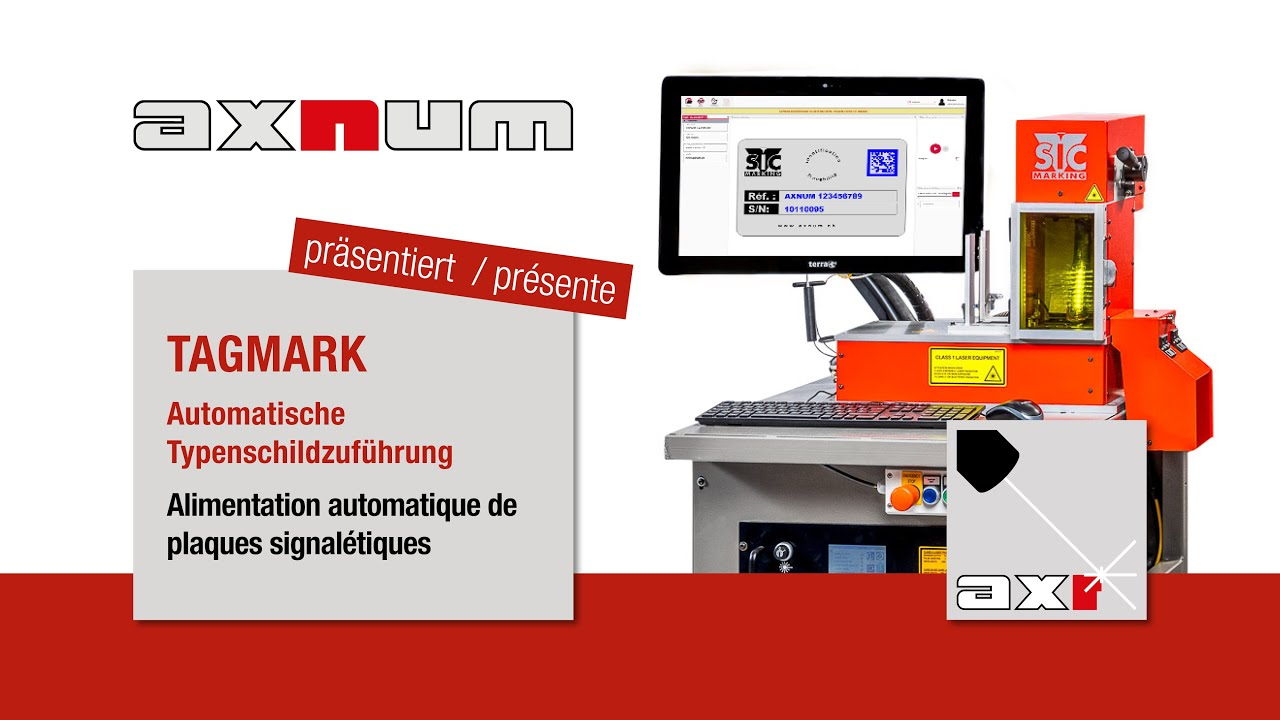 Der TAGMARK ist mit bis zu 2 Typenschild-Zuführungen ausgestattet. Darüber hinaus ist es möglich Typenschilder von Hand einzulegen. Die Typenschilder werden in Magazinen gestapelt und nach dem Markieren in einen Typenschild-Auffangbehälter entladen. Ein Standard-Absaugungsanschluss saugt direkt an der Markierstelle ab, sodass es zu wenig Verschmutzung an der Linse kommt.