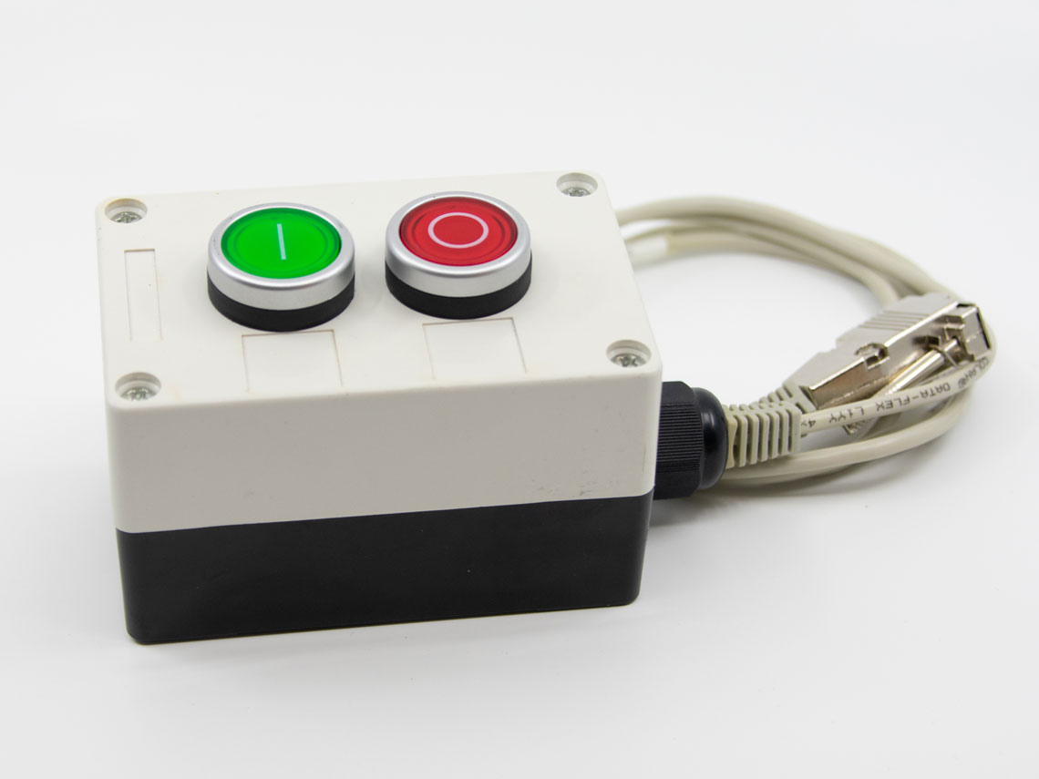 Die Box mit Knöpfen für Start und Stop des Markiersystems ermöglicht die Auslösung des Markiervorgangs über manuelles betätigen des Markiervorgangs. Die Länge des Verbindungskabel zum Controller beträgt 2.5 m.