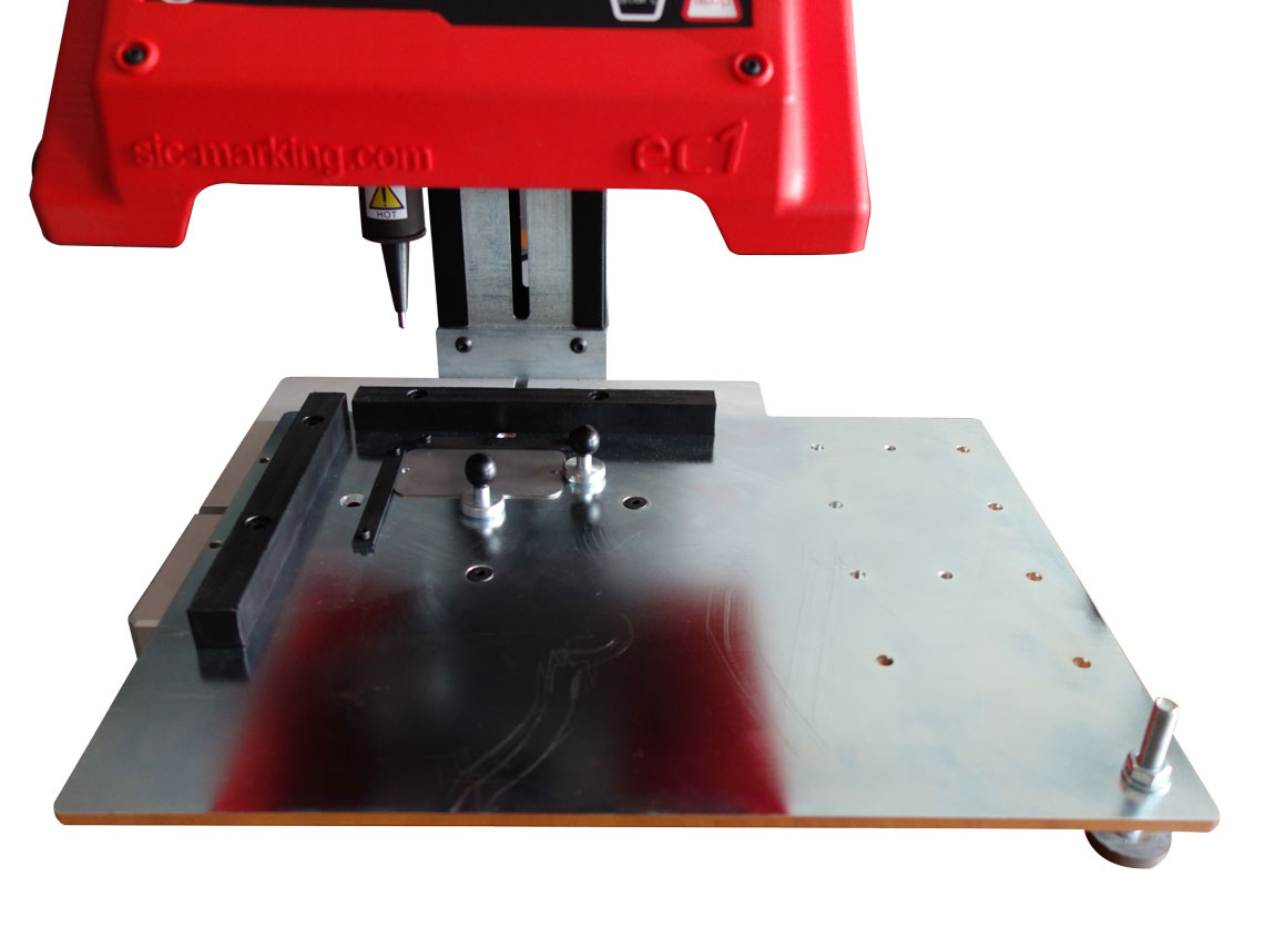 Exakte und sichere Fixierung Ihrer Typenschilder. Mit dem Typenschildhalter können Sie in der verlängerten Ausführung, Typenschilder von 105mm x 145mm prägen und bequem über einen Schnellspanner wechseln.