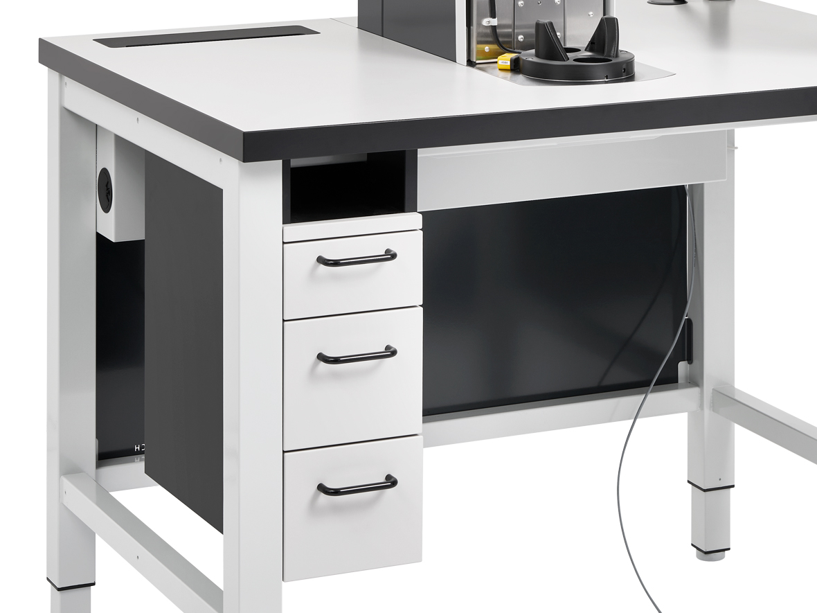 Der integrierte Schubladenstock trägt wesentlich zu einem aufgeräumten Arbeitsplatz bei. Durch die klare Organisation der Werkzeuge und Materialien wird nicht nur die Produktivität erhöht, sondern auch Verletzungsgefahren durch herumliegende Gegenstände eliminiert. Der Schubladenstock ist als optionales Zubehör zu Ihrem Arbeitstisch erhältlich.