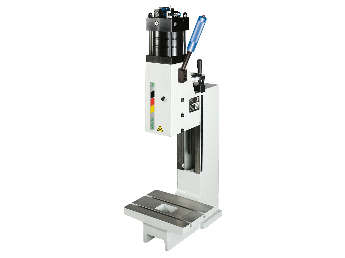 Bei luftunterstützten Handhebelpressen wird die Zustellbewegung per Hand ausgeführt, nur die effektive Pressbewegung wird über den pneumatischen Zylinder vollzogen. Definierter Start des Krafthubs : Ausführen des Zustellhubs über den Handhebel und Kniegelenk. Der Krafthub von 5,9mm wird durch drücken des Knopfes oder wahlweise einer Drehbewegung des Handhebels definiert ausgelöst.
