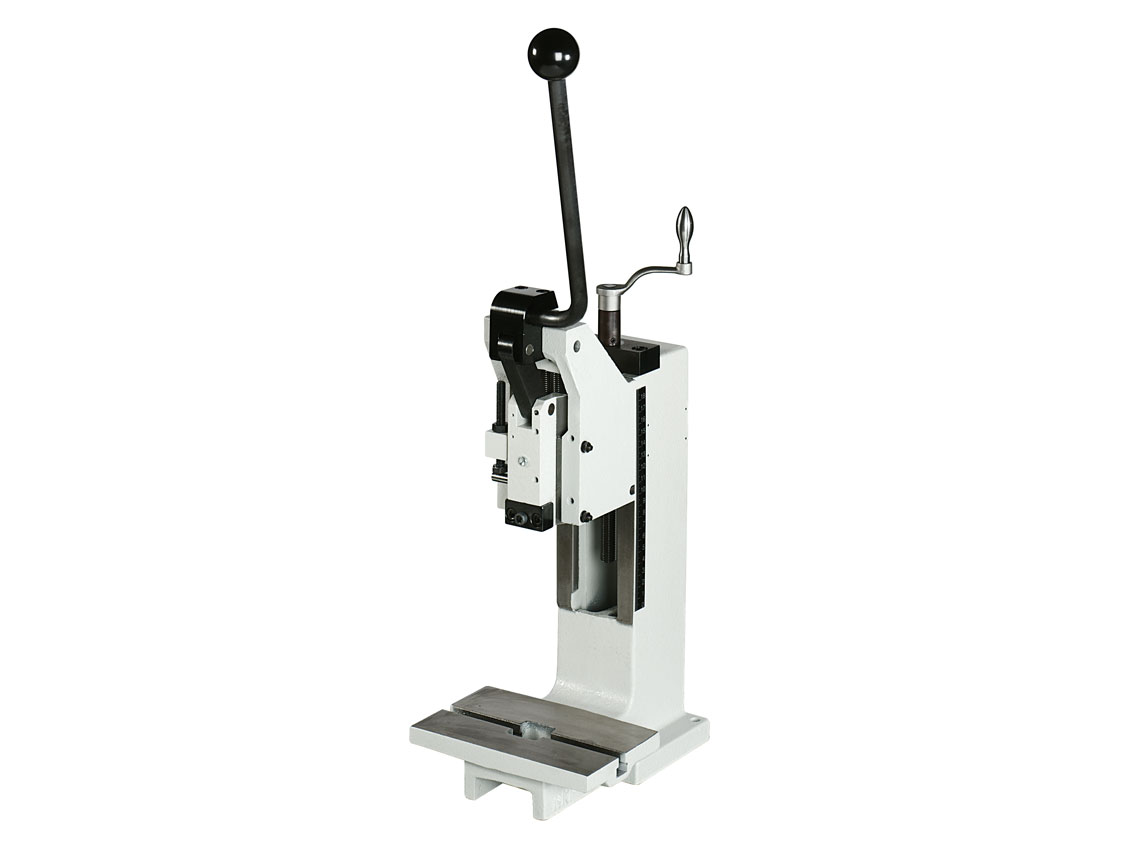 Bei Handpressen wird unterschieden zwischen Zahnstangen- und Kniehebelpressen. Kniehebelpressen sind komplexer in der Kraftumwandlung als Zahnstangenpressen. Sie bieten aber bereits Kräfte bis 55kN. Kniehebelpressen ermöglichen über einen kurzen Pressenhub eine grosse Presskraft im unteren Totpunkt.