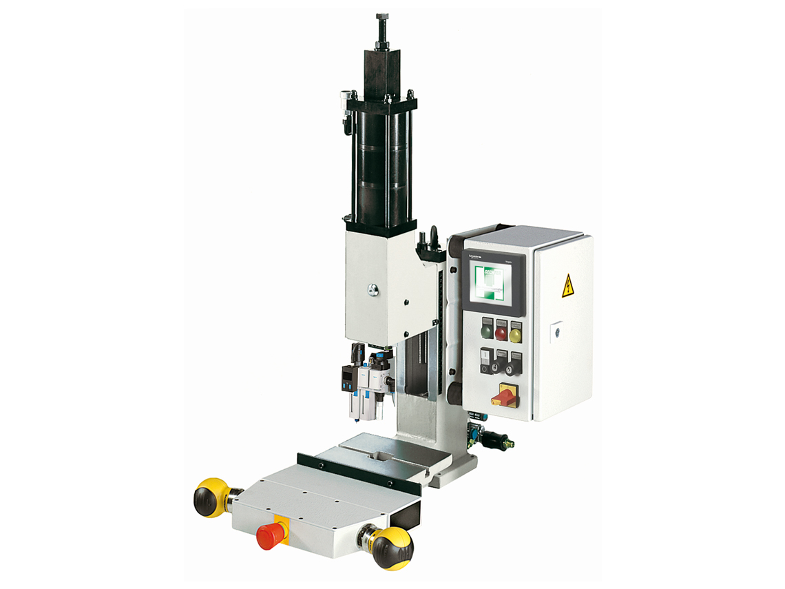Linearwirkende Pneumatikpressen arbeiten ohne manuelles Eingreifen des Anwenders. Der Pressvorgang wird meist über eine Zweihandsicherheitssteuerung initialisiert. Die LP-Maschinenserie bietet einen sehr geringen Luftverbrauch durch spezielle Mehrkammerzylinder und hat serienmässig einen stufenlos verstellbaren Hub von 40mm.