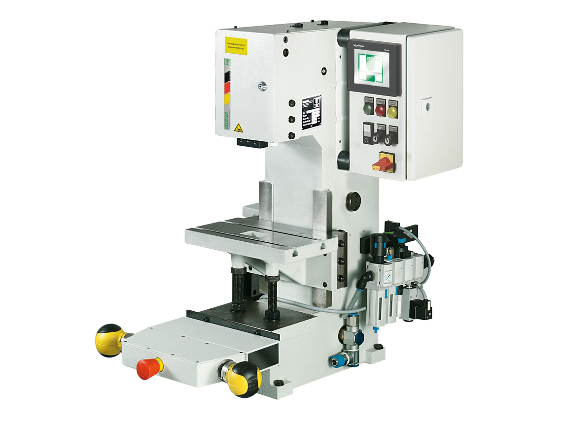 Pneumatische Kniehebelpressen arbeiten ohne manuelles Eingreifen des Anwenders. Der Pressvorgang wird meist über eine Zweihandsicherheitssteuerung initialisiert. Diese pneumatische Kniehebelpresse wird vor allem für Grossserien empfohlen. Geringer Luftverbrauch durch die Kniehebelübersetzung sowie die speziellen Mehrkammerzylinder.