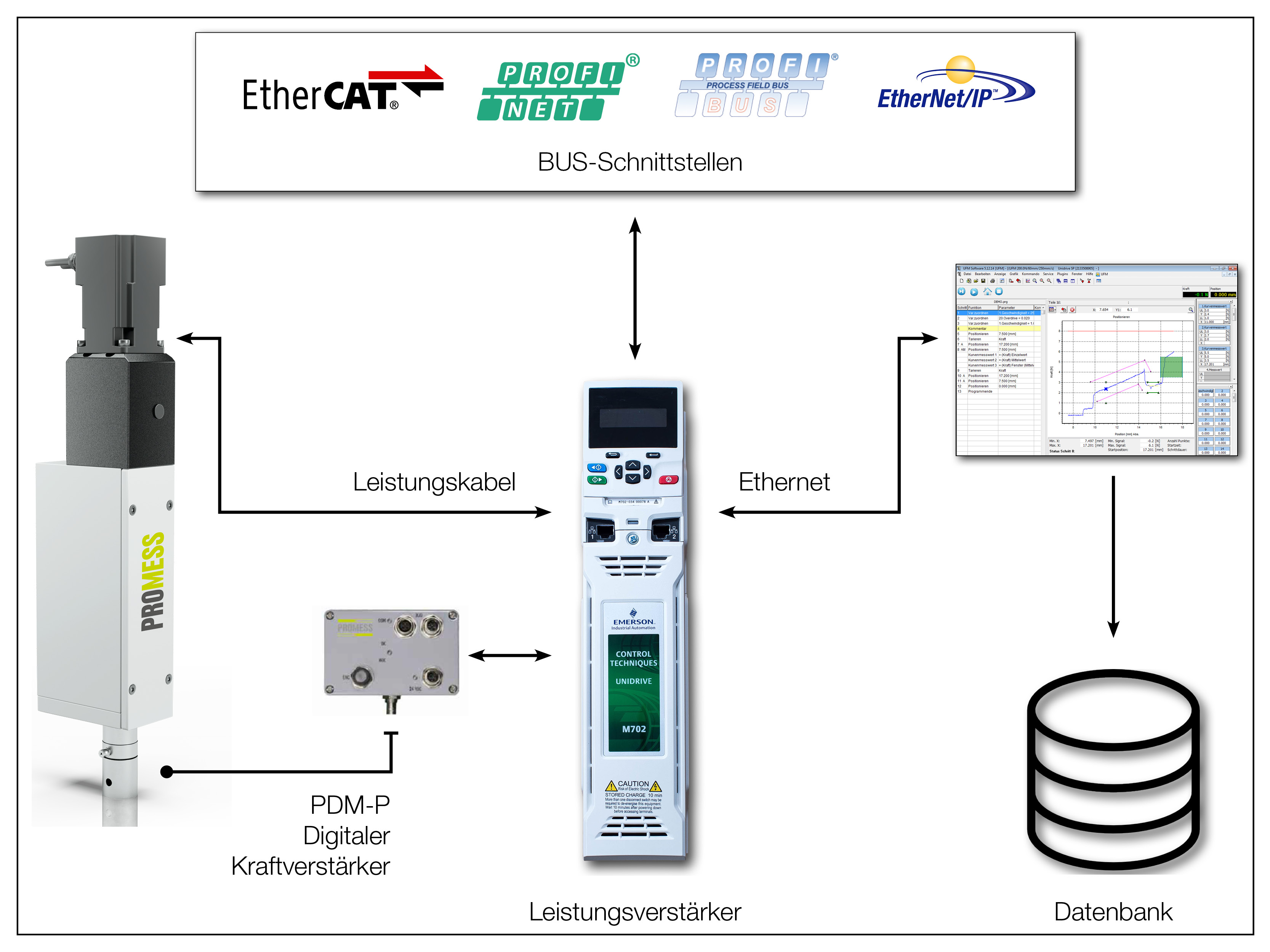 Die UFM V5-Software steuert den Antrieb der Servopresse und erfasst und interpretiert die Steuersignale. Die Signale Kraft und Position sind standardmässig konfiguriert. Zwei numerische Steigungssignale, ein Berechnungseingang und vier zusätzliche Signale sind frei konfigurierbar. Das UFMR-Database Plugin, das standardmässig mit jeder Servopresse geliefert wird, zeichnet bei jedem Zyklus Prozessdaten auf.