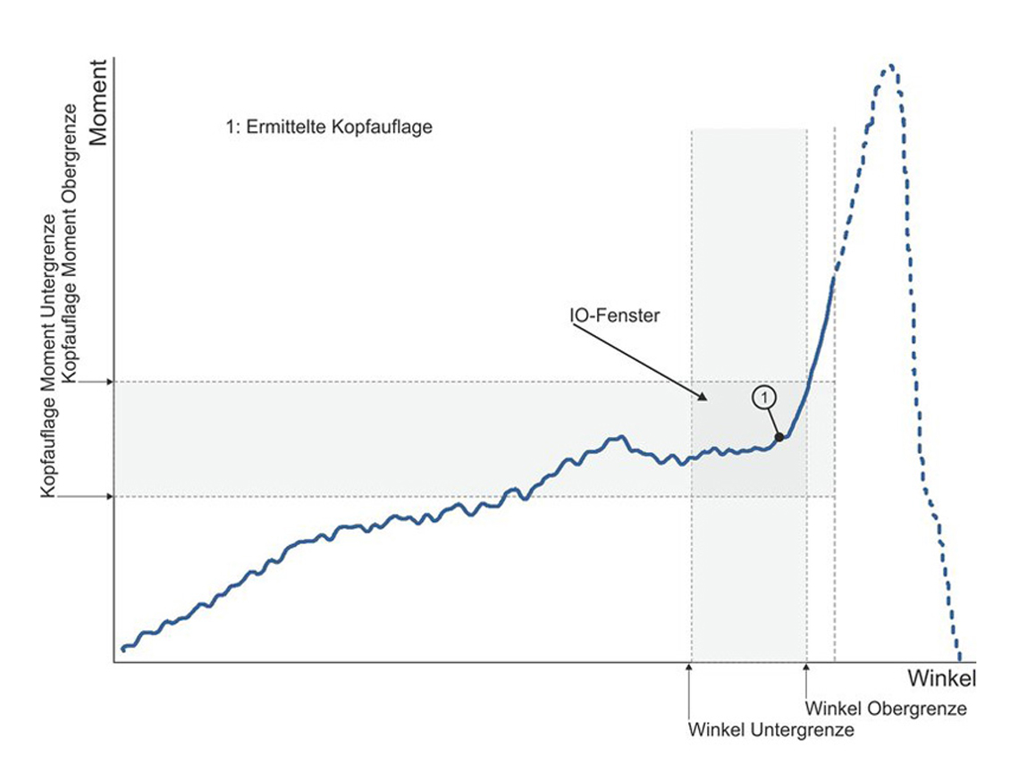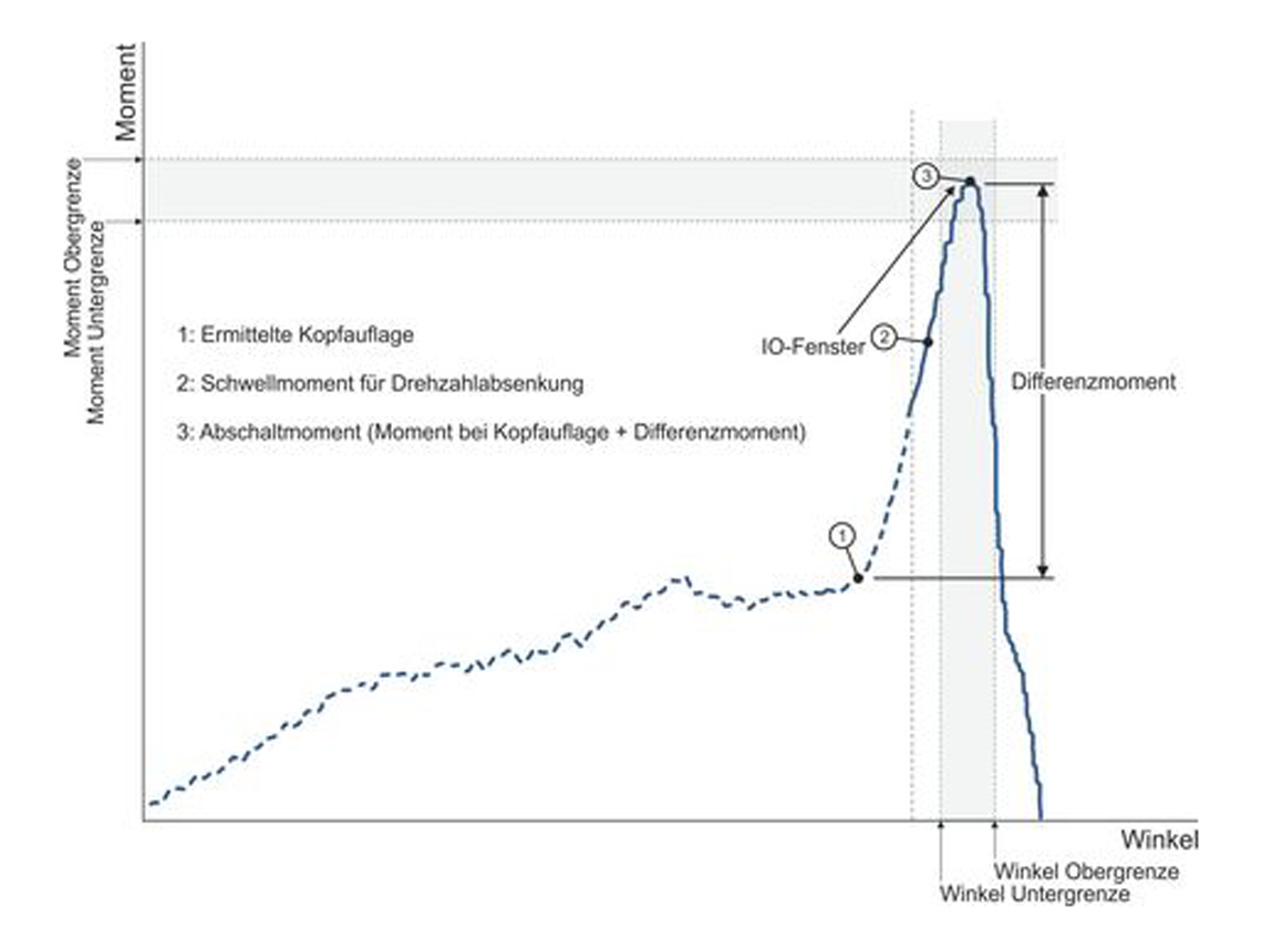 Hauptbestandteil ist die Kopfauflageerkennung: Auf Basis des Drehmomentverlaufs wird kontinuierlich eine mathematische Bewertungsfunktion gebildet. Die Kopfauflage gilt als erkannt sobald diese Funktion einen fest definierten Grenzwert überschreitet. Drehmoment und Drehwinkel werden zum Zeitpunkt der Kopfauflage rückwirkend errechnet.