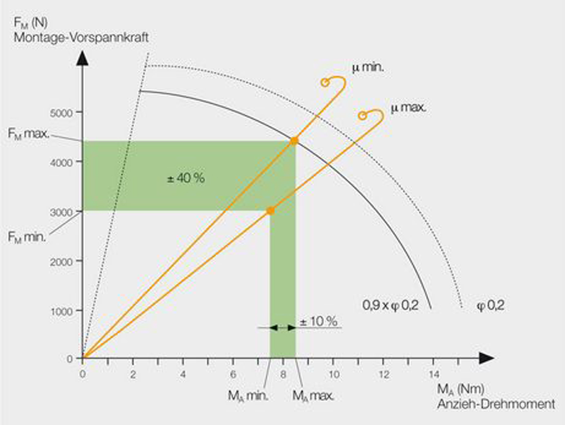 Aus diesem Grund muss die Schraubverbindung immer so überdimensioniert sein, dass sie bei einer Abweichung nach oben nicht überlastet wird und bei einer Abweichung nach unten noch immer die geforderte Vorspannkraft aufbringt. Dies ist ein wichtiger Faktor bei der Konstruktion von Schraubverbindungen.