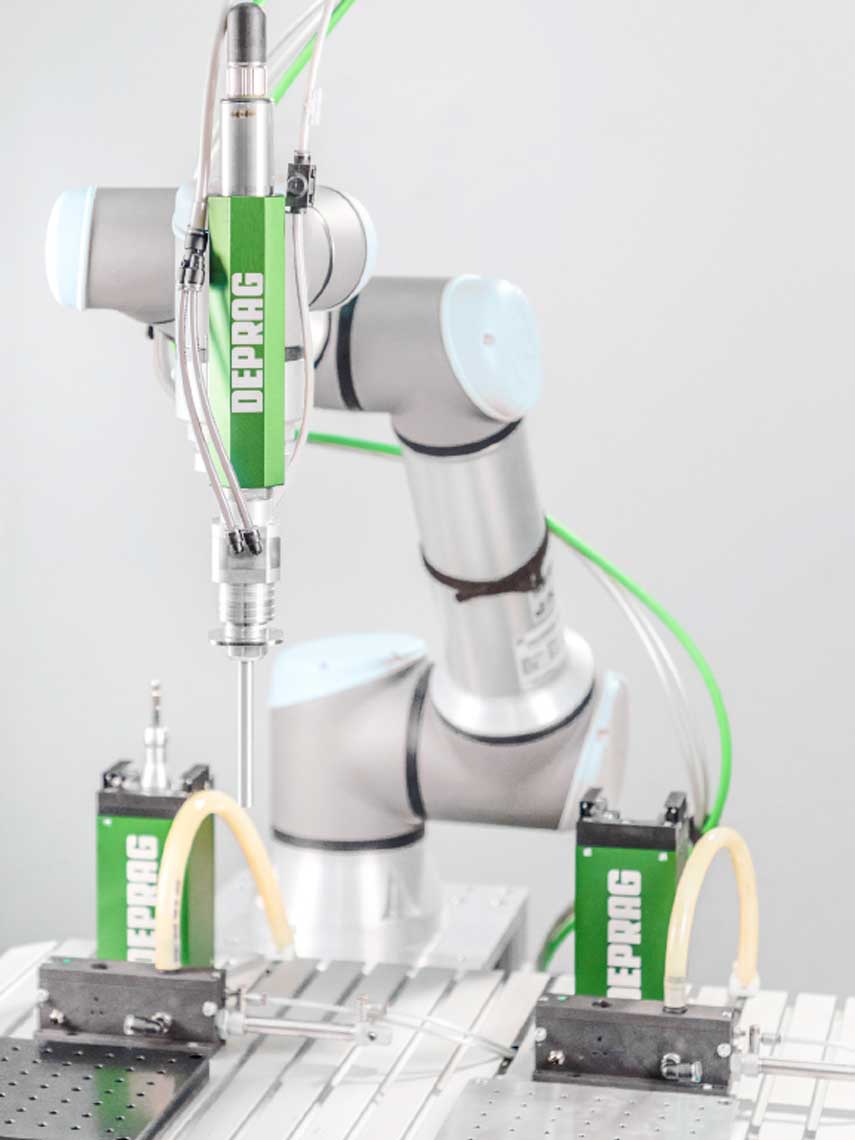 Das frei parametrierbare Schraubsystem (Drehmoment, Drehwinkel, Drehzahl) ist zudem modular adaptierbar für diverse Werkzeuge und beliebig erweiterbar für unterschiedliche Schraubapplikationen. Der DEPRAG Tool Changer bietet zudem eine 100% Rückverfolgbarkeit durch die automatischen Prozessdatendokumentation.
