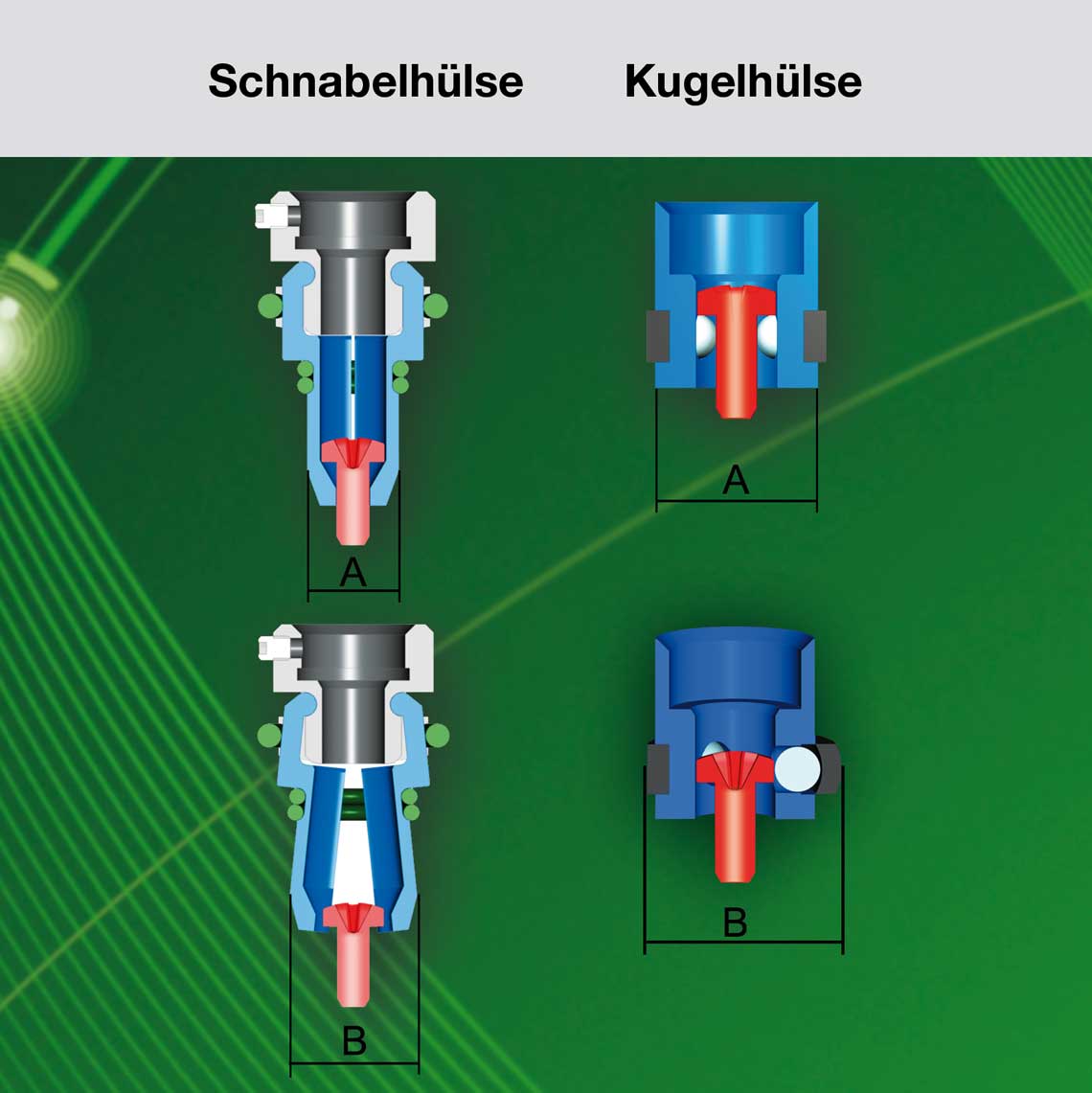 Am Ende des Mundstückes werden zur Aufnahme und Positionierung der Schraube Kugelhülsen oder sogenannte Schnabelhülsen montiert. Je nach Schrauben- oder Bauteilgeometrie kommt eine Kugelhülse oder eine Schnabelhülse zum Einsatz.
