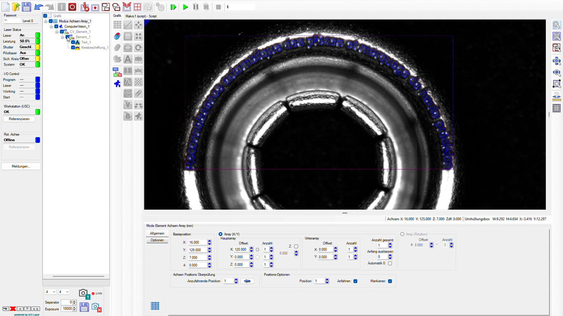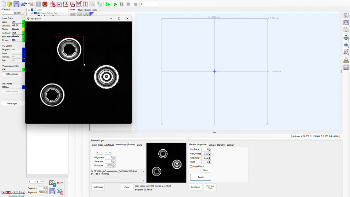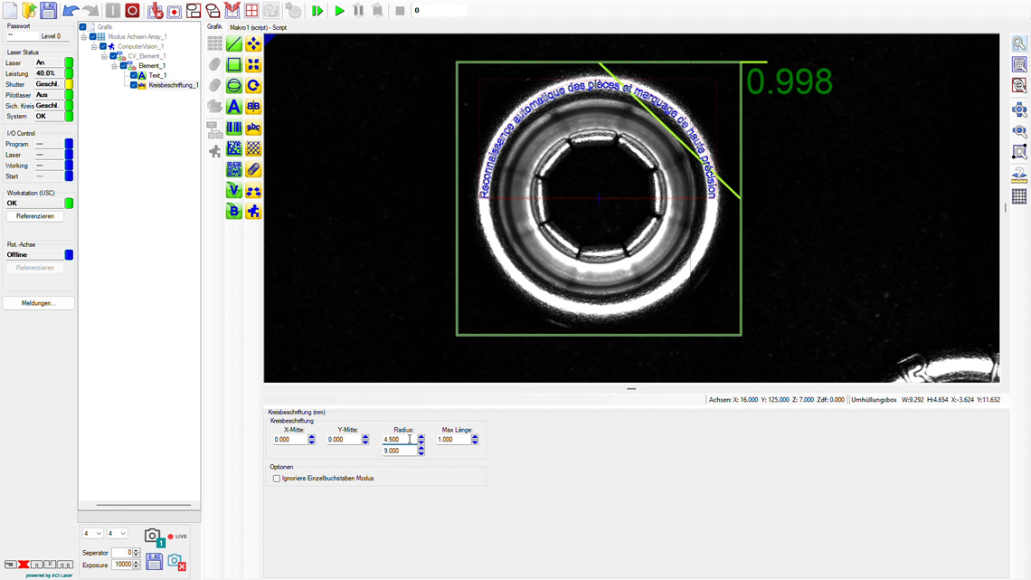 Les pièces à marquer sont détectées par une caméra dans la trajectoire du faisceau laser et peuvent ainsi être marquées automatiquement avec une précision maximale. L'avantage est que les pièces ne doivent pas être alignées. Il n'est pas nécessaire de recourir à des supports de pièces coûteux, ni de placer toutes les pièces dans la même orientation prédéfinie dans le laser. Les pièces à marquer sont soit placées en vrac, soit poussées dans le laser avec le bac à pièces.
