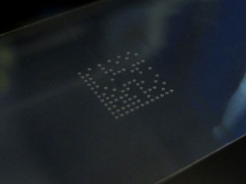Pour le marquage des surfaces en verre, le matériau est chauffé à haute température de façon ponctuelle. On réalise ainsi un léger enlèvement de matière. Selon le type de verre, il est possible de créer des marquages très nets, aux contours très homogènes.