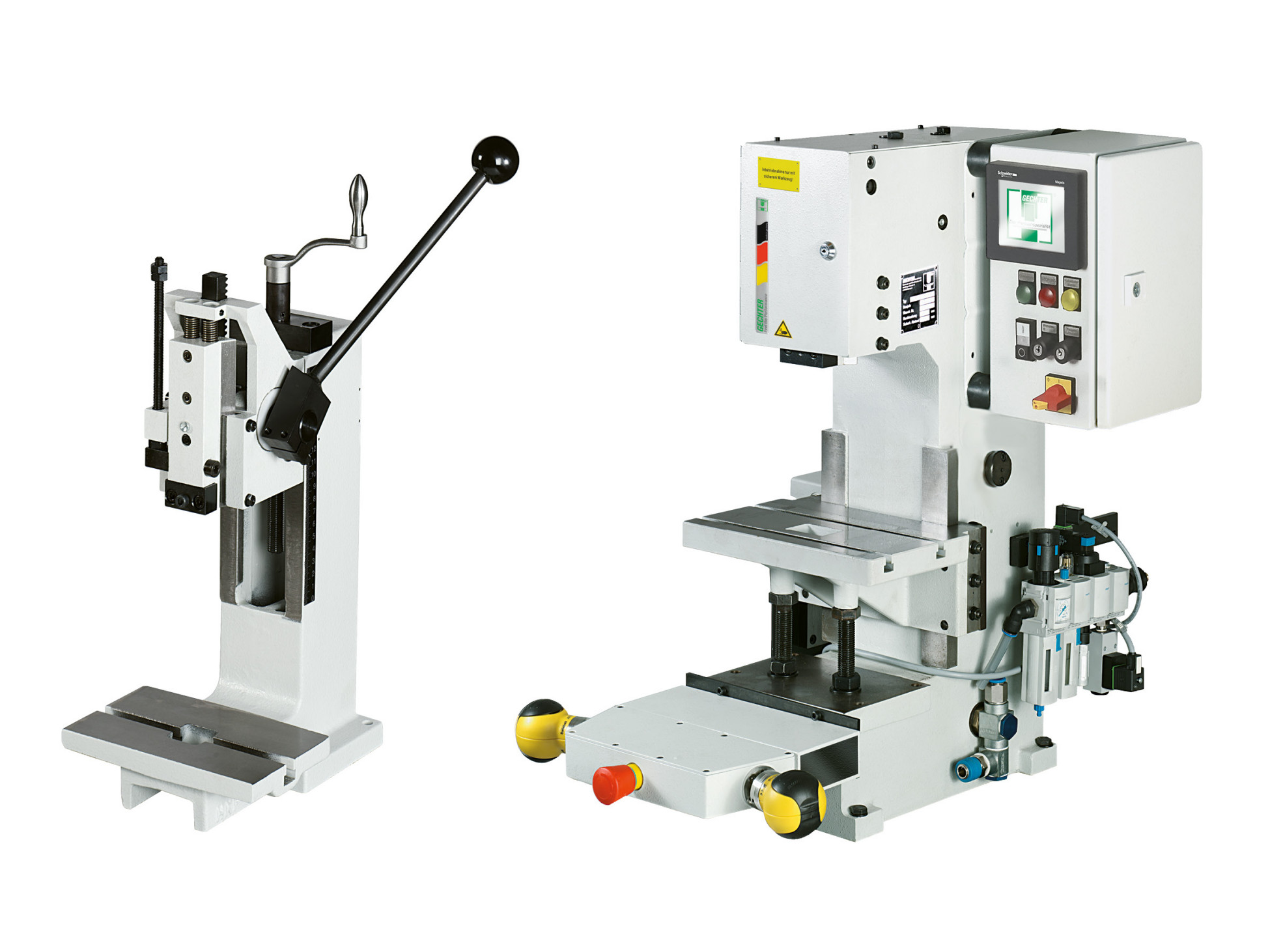 La force de pression peut être régulée sans paliers en réduisant la pression d’entrée. Une presse peut en outre être équipée de la surveillance « Force/Position » au moyen de fenêtres ou de courbes enveloppe. Ces presses existent sous forme de presses de table, de presses à arcades ou d’unités de presse intégrées à des postes automatiques. Les presses pneumatiques ont l’avantage d’être économiques pour la haute puissance délivrée.