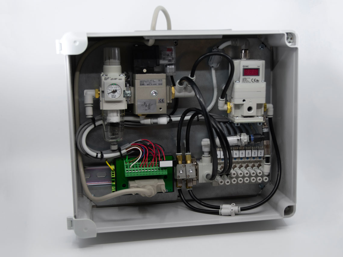 Notre groupe pneumatique est intégré à l’arrière de la machine et permet le pilotage d’éléments pneumatiques simples et le maintien ou la préhension des pièces par vacuum.