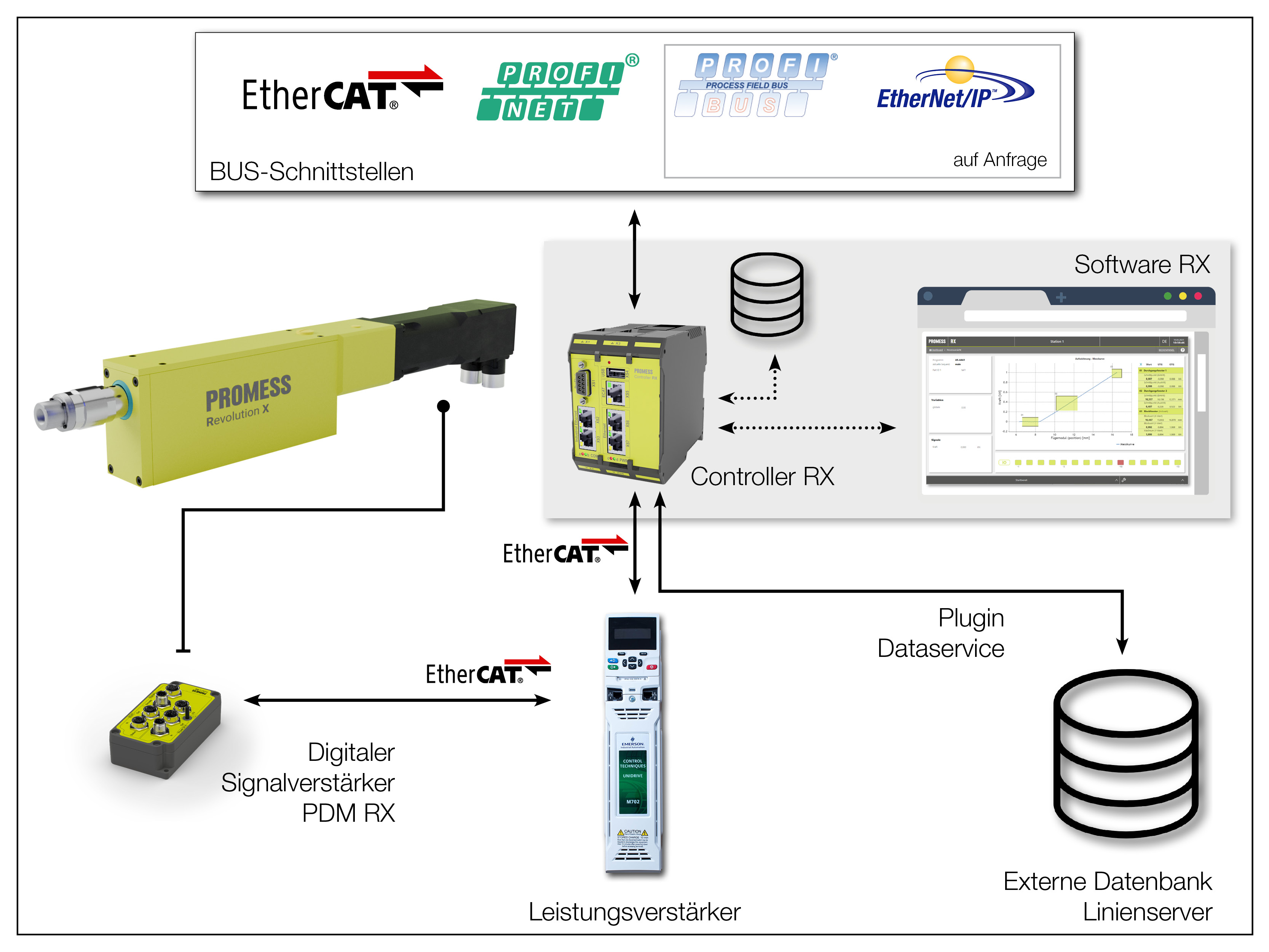 La servopresse Précision5 RX est pilotée et surveillée par le contrôleur RX central. Celui-ci permet de piloter simultanément jusqu’à 4 mécanismes et 16 capteurs. Le signal de force de la servopresse est transmis sans pertes du convertisseurs de signal digital PDM RX au contrôleur. Une entrée TTL permet de raccorder un palpeur de mesure supplémentaire. Le codeur absolu intégré garantit un positionnement précis du coulisseau de presse et rend inutile une course de référence au début du cycle. L’évaluation des données s’effectue directement dans le contrôleur RX. Les programmes et les courbes de processus peuvent y être archivés. Les données de processus sauvegardées peuvent être récupérées par un service de données puis traitées ultérieurement.