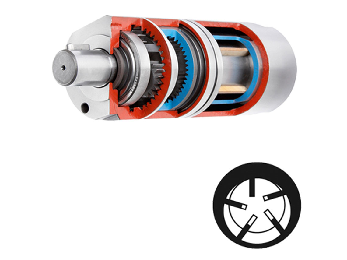 Un moteur pneumatique à palettes transforme l'air comprimé en mouvement rotatif : un rotor excentrique presse les palettes contre la paroi du rotor et forme des chambres de travail dans lesquelles l'air comprimé se dilate. Le rotor tourne, la vitesse de rotation s'adapte automatiquement à la charge. Le moteur fonctionne de manière optimale à environ 50 % de la vitesse de rotation à vide.