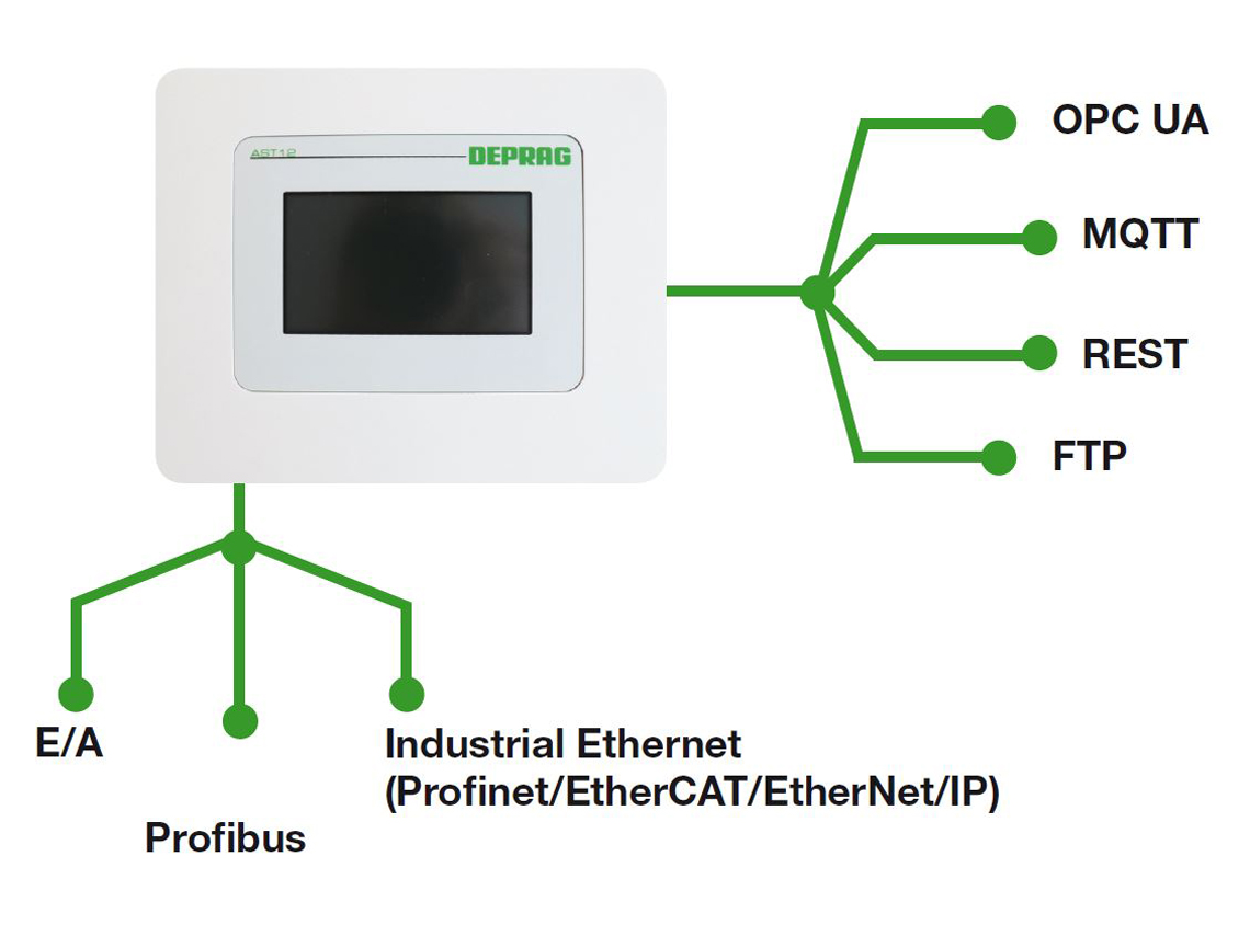 La commande séquentielle AST12 remplace les anciennes commandes et offrir un concept cohérent et flexible en ce qui concerne les interfaces de communication système et les interfaces Industrie 4.0. La commande peut s’effectuer via E/S Standard, Profibus ou Industrial Ethernet (Profinet, EtherCAT, EtherNet/IP). Les interfaces Industrie 4.0 incluent OPC UA, MQTT, REST et FTP. Elles sont la condition préalable à la communication de machine à machine et au bon échange de données - l’atout en matière de connectivité.